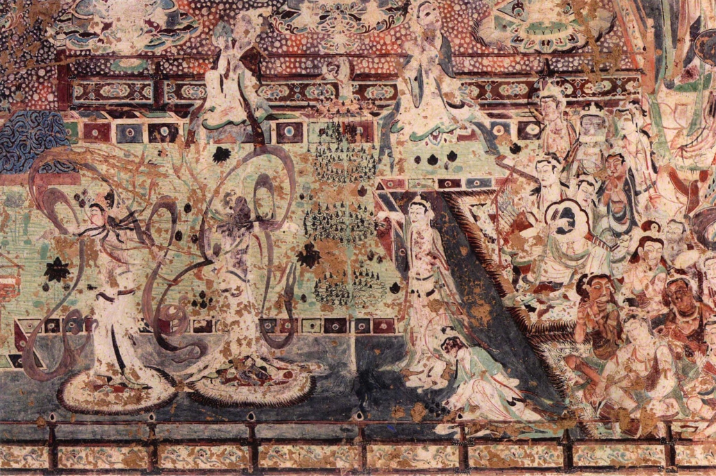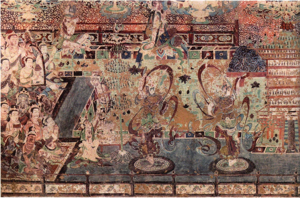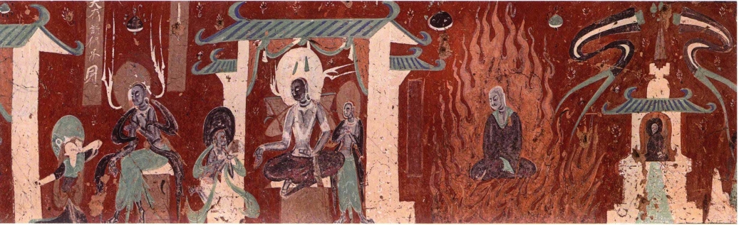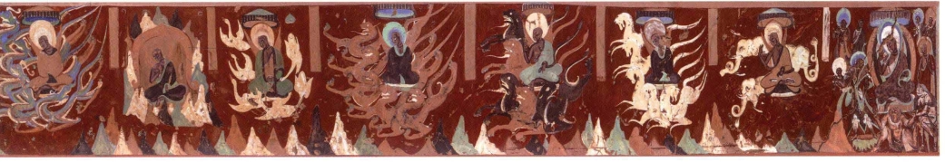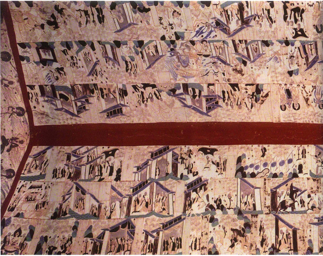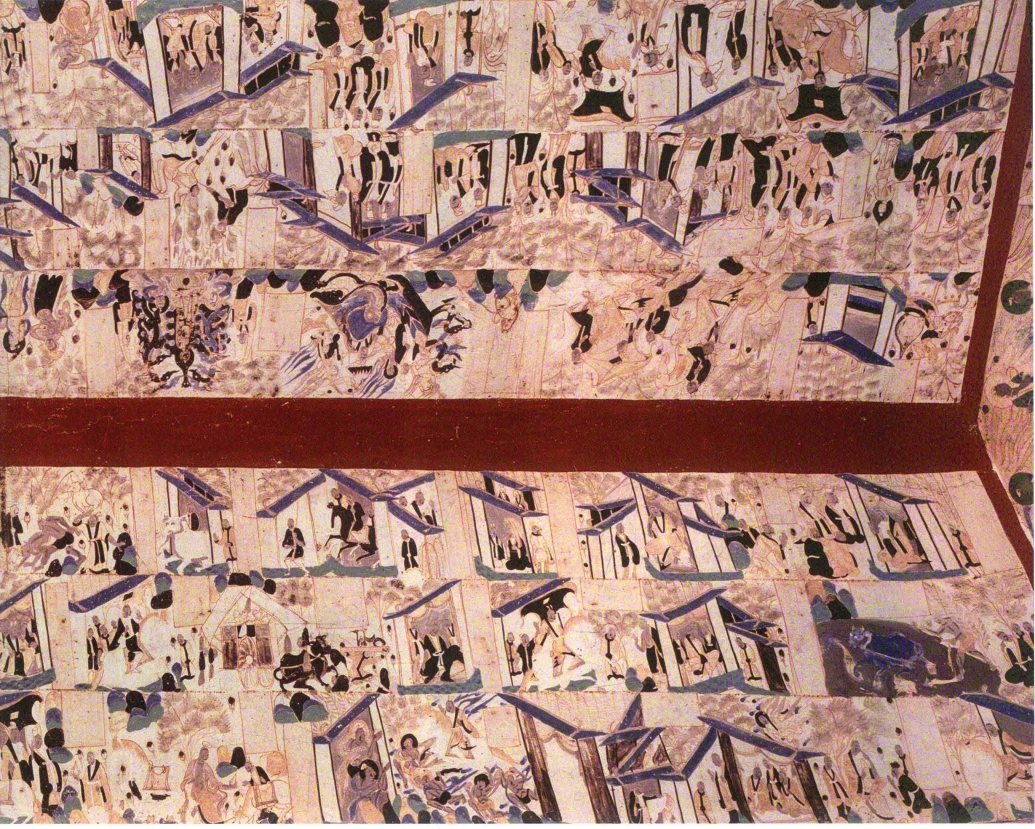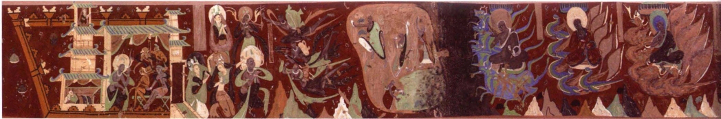 此壁画据《修行本起经》制绘,讲释迦牟尼平生事迹。画面描绘了从乘象入胎到释迦成道、初转法轮等80多个情节。此幅壁画采用汉晋绘画传统的横幅长卷式布局,按“之”字形走向衔接上下各层画面,故事完整,内容丰富,为此前的佛传艺术品中所少见。