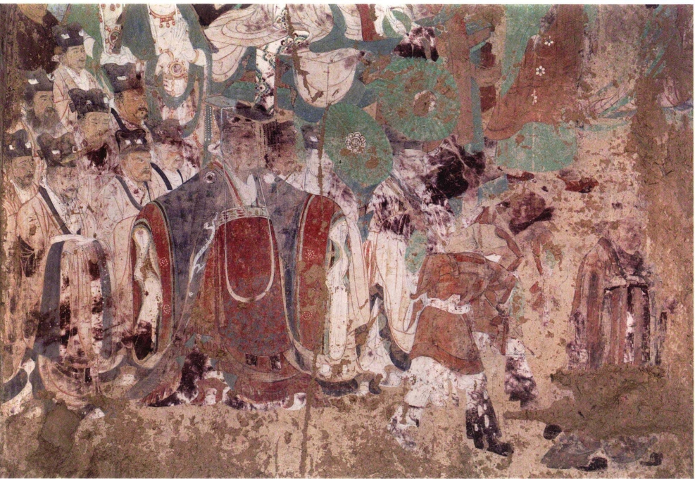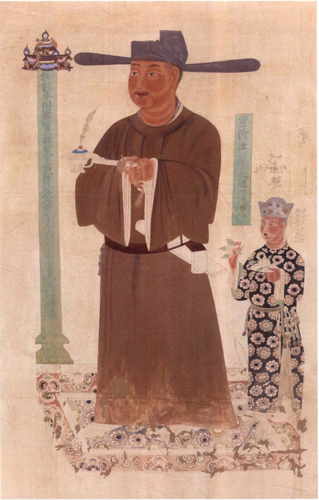 曹元忠,第三任曹氏归义军节度使,曹氏归义军政权创建者曹议金第三子。此像榜题“推诚奉国保塞功臣敕归义军特进检校太师兼中书令谯郡开国公曹元忠一心供养”,其后一身小的男像榜题“男将仕郎延禄”,为其子曹延禄,是研究敦煌古代史和服饰史的形象资料。