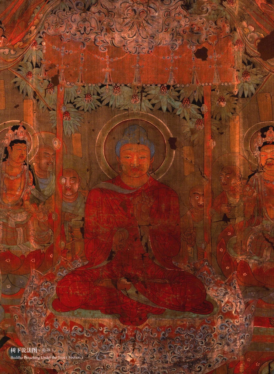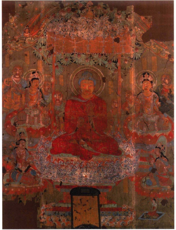 佛身穿通肩朱红袈裟,居中结跏趺坐于莲台上作说法印。左右各画一胁侍菩萨,头戴化佛宝冠,裸上身,饰以璎珞环钏,坐莲座上作听法状。菩萨身后各有三比丘,绕佛而坐。胁侍菩萨下方各画供养菩萨,一执宝瓶,一捧莲花供养于佛。画面左右下方各有一供养人,左下一身穿紧身窄袖衫,手捧莲花胡跪供养,右下仅存帽顶。佛座下有碑形愿文牌,菩萨、比丘旁都画有榜题牌,均无字。