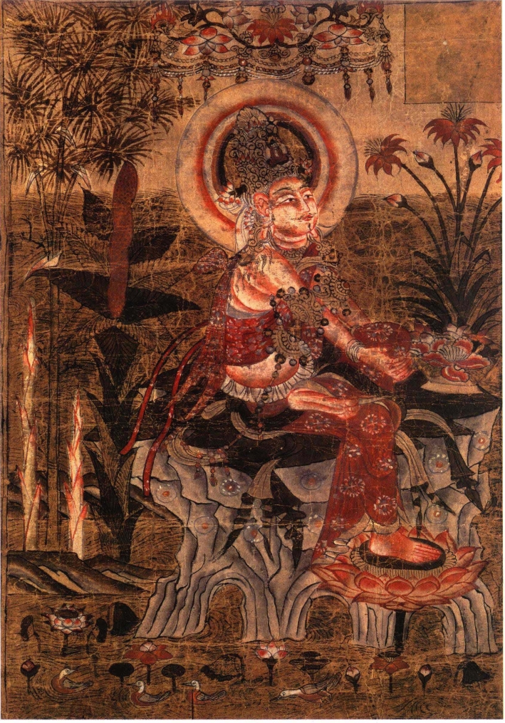 图中观音菩萨于莲池岩石上,右足踏红莲,左足放在右腿上,双手抱膝游戏而坐,神情恬淡闲适,悠然自得。身后有修竹、棕等南方植物,表现的是南海补陀落迦山的水月观音。水月观音画像,相传是唐代著名画家周昉所创绘,唐代诗人白居易所写《画水月观音菩萨赞》:“净渌水上,虚白光中,一睹其相,万缘皆空。”道出了整幅画面的意境。