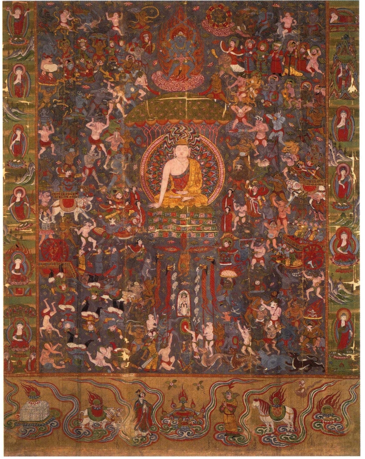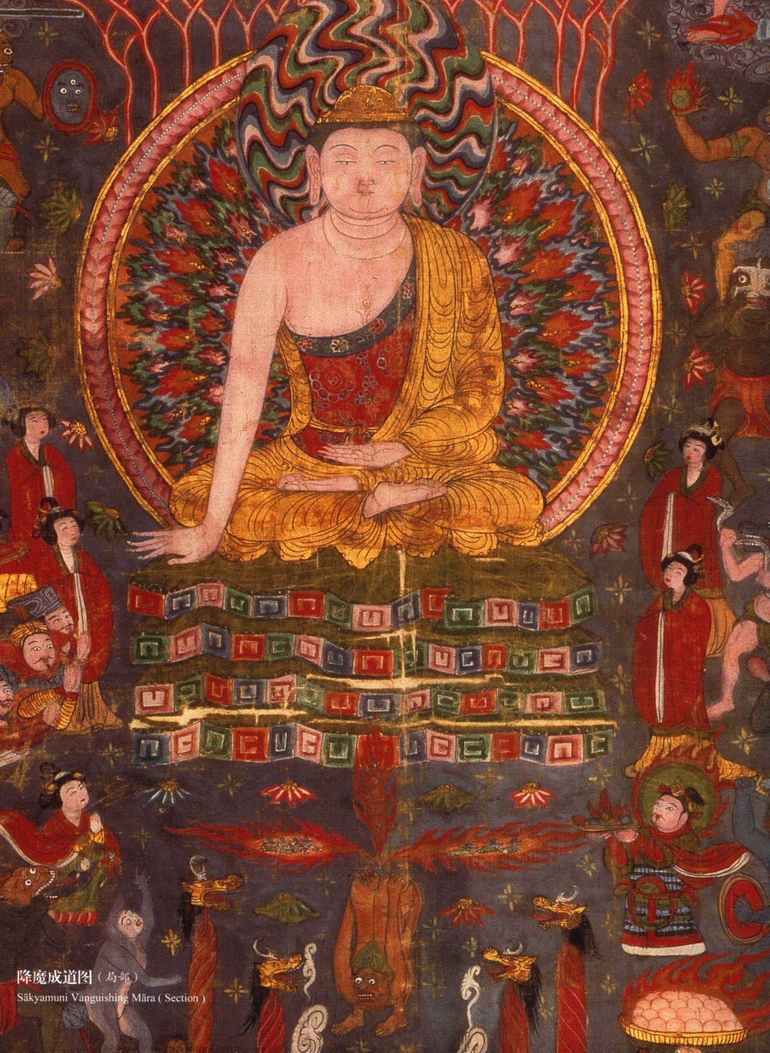 该画表现佛传故事中降魔成道的场面,是同时期较为少见的作品。画面中央描绘在华丽天盖下结跏趺坐的释迦,手结降魔印;上方立于云端的是三面八臂的降三世明王。佛周围是姿态各异的魔军恶鬼,分别绘有进攻佛陀和降伏皈依的情节。色彩丰富,描绘细腻,布局周到。画面左右佛陀诸相的表现,暗示佛的神通,下部绘白象宝、玉女宝、兵宝、马宝等佛教七宝图。