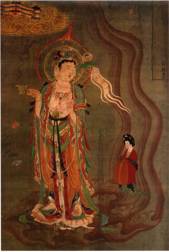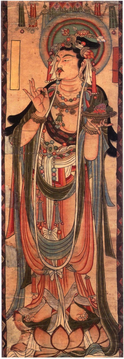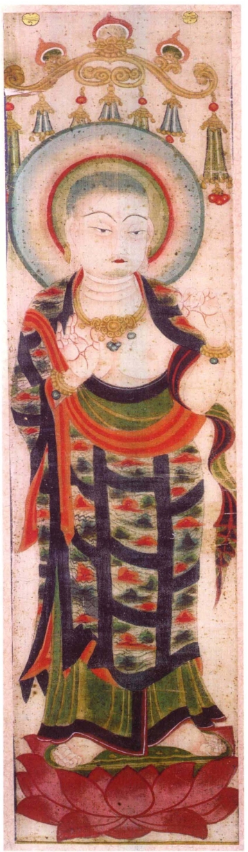 菩萨站立于大莲台上,着粗墨色绘制的田相纹袈裟,田相纹中又施绿、青、红色相间晕染的远山形纹样。此幅幡绘分为三段式,包括上端的纹样带以及幡头,中部的像身,幡身下端的纹样带。它保留了自幡头的顶部开始到幡脚下端的木制卷轴,画面色彩保存良好。