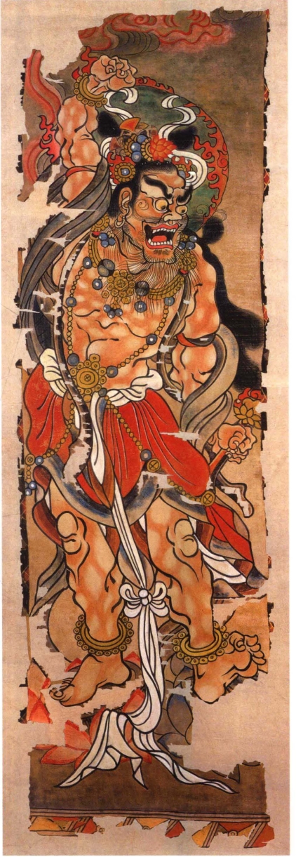 金刚力士头有火焰圆光,怒眉凸眼,张口怒吼,胡须飞扬,腰束裙,上身及腿脚袒露于外。肌肉暴起,右手握拳上举,左手下垂紧握金刚杵,一足前踩,一足后蹬,足指张开,披帛绕身,冠带飘举,充满愤怒与力量。力士身上的线描,凝滞沉郁,以厚重的赭红晕染,突出其块状肌肉,表现了金刚的雄健和神力。