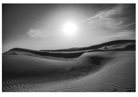 沙漠晌午的太阳让人无所逃遁,无论你往哪个方位走,它始终挂在正上方,好像被固定住一般,时间过去了好久也没见一丝挪移,以致人的身影始终是矮小未被拉长的。在大漠里偶见一两棵胡杨树,心里的盼头就是以为可以在树荫下乘凉休整。于是,你用力走啊走,看似就在不远处,可是在沙丘堆里走上走下,绕来绕去的,明明仿佛才200米的距离,居然要用半个小时才能走完。等你走到胡杨树下,发现根本就没有树荫。只能悻悻地继续往前走……