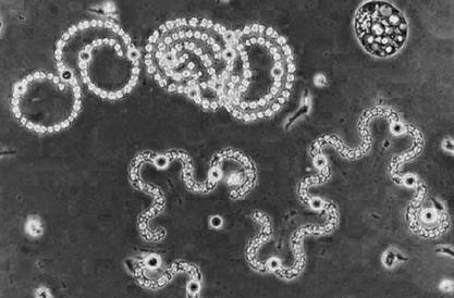 原核细胞指没有核膜且不进行有丝分裂、减数分裂、无丝分裂的细胞。这种细胞不发生原生质流动,观察不到变形虫样运动。鞭毛(flagellum)呈单一的结构。光合作用、氧化磷酸化在细胞膜进行,没有叶绿体(chloroplast)、线粒体(mitochondria)等细胞器(organelle)的分化,只有核糖体。由这种细胞构成的生物,称为原核生物,它包括所有的细菌和蓝藻类。即构成细菌和蓝藻等低等生物体的细胞。它没有真正的细胞核(nucleus),只有原核或拟核,所含的一个基因带(或染色体),是环状双股单一顺序的脱氧核糖核酸(DNA)分子,没有组蛋白(histone)与之结合无核仁(nucleolus),缺乏核膜(nuclear envelope)。外层原生质中有70S核糖体与中间体,缺乏高尔基体(Golgi)、内质网(E.R.)、线粒体和中心体(centrosome)等。转录和转译(transcriptionand translation)同时进行,四周质膜内含有呼吸酶。无有丝分裂(mitosis)和减数分裂(meiosis),脱氧核糖核酸(DNA)复制后,细胞随即分裂为二。