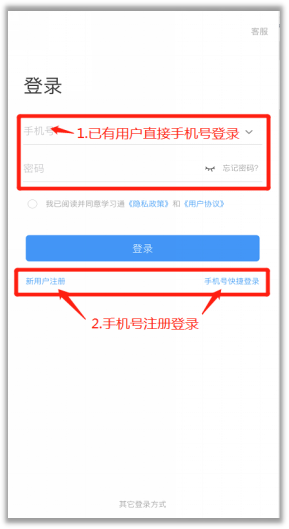 【2】未注册登录:未使用过的,可以点击“新用户注册”,或者“手机号码快捷登录”,进行手机号注册登录。