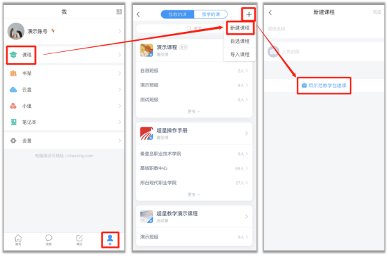 “学习通”,在首页点击“课程”,进入课程页面。点击右上角“+”——“新建课程”,选择“用示范教学包建课”,选择对应课程。点击对应课程后面的“建课”,即可创建课程。