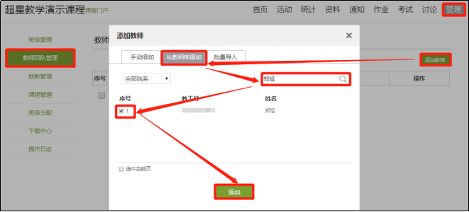 1)进入管理——教师团队管理/助教管理,选择从教师库添加,搜索教师的工号或者姓名(不要筛选院系),点击搜索,勾选要设置的教师,点击页面下方的添加。