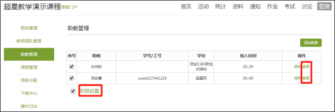 2)添加成功后,可以对指定教师或全体教师设置管理权限。点击对应教师后面的“查看”,或者勾选对应教师,现在页面下方的权限设置,进行相应的权限设置。