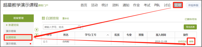 电脑端移除学生:进入课程——管理,点击对应班级,找到对应学生后面的“移除”,即可移除学生。移除学生之后,该学生在课程下的所有的学习记录将不再保留,请谨慎操作!