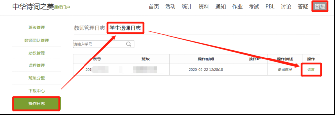 不小心移除错学生,或者学生不小心退班,想要恢复,需要建课教师用电脑端进入课程——管理,点击左侧导航栏中的“操作日志”——“学生退课日志”,找到对应学生后面的恢复,即可恢复学生及该学生的学习数据。