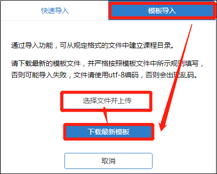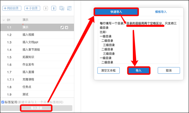 目录支持一次性导入,可直接“快速导入”,按照编辑要求,填写到导入框。也可以使用“模板导入”,下载txt格式模板,按照要求编辑后导入。