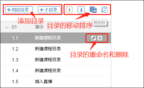 在章节编辑界面的左侧,可以新增章节,移动章节,调整章节位置。可以修改章节名称,删除章节。