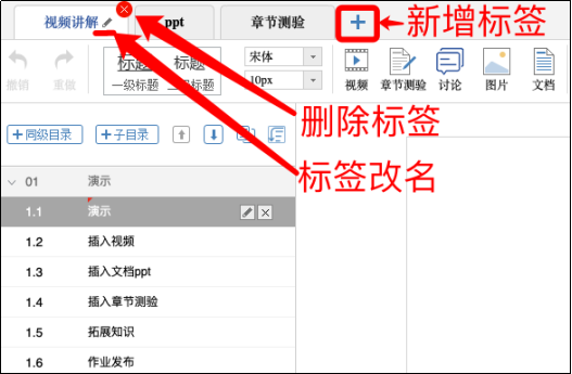 在章节编辑界面左上角,可以新增标签、删除标签、标签改名。