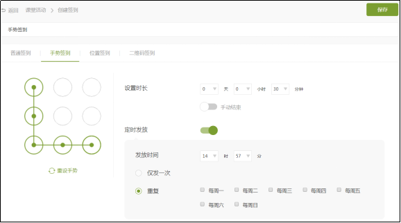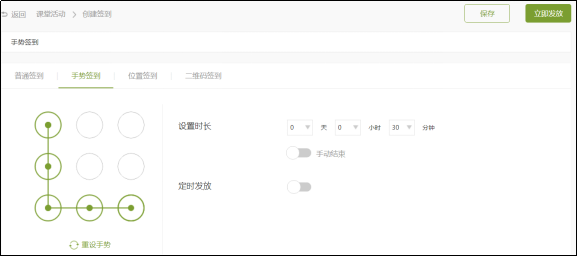 【2】电脑端:以“手势签到”为例,点击活动列表中的“签到”,选择“手势签到”,老师设置签到手势,点击“立即开始”或“保存”。如需定时发放,则设置发放时间及重复时间,点击保存。在页面的任务列表中,可以点击开始、结束或删除等操作。