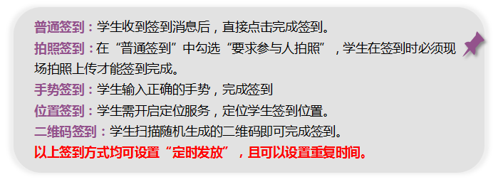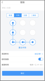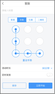 【1】手机端:以“手势签到”为例,点击“+”里的“签到”,选择“手势签到”,老师设置签到手势,点击“立即开始”或“保存”。如需定时发放,则设置发放时间及重复时间,点击确定。