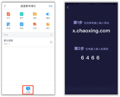 2)在电脑上打开浏览器,按照手机提示,①输入网址:x.chaoxing.com;②输入随机生成的投屏码,开启投屏。