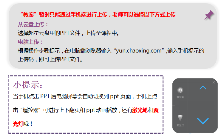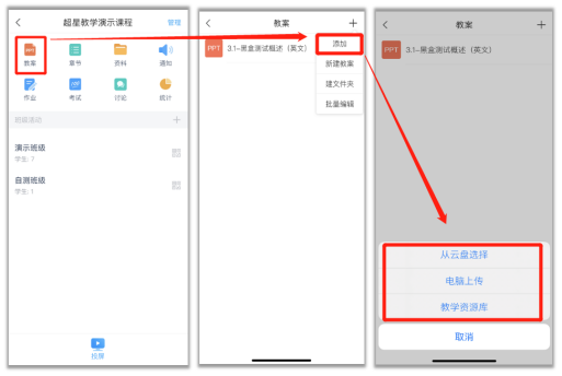 “课程,点击“教案”,将上课要讲的ppt提前上传至此处(如图)老师可以提前备课,并在课堂上授课使用。