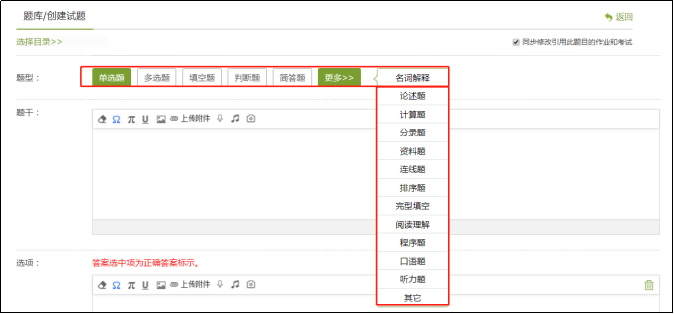 “资料”模块,切换到“题库”,点击“添加题目”。手动录入支持题型较多,基本涵盖所有常用到的题型。
