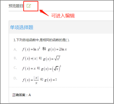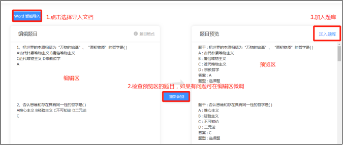 ●单选、多选、判断、填空,必须要包含题干和答案,否则容易识别错误。(学生答题过程中看不到答案)。