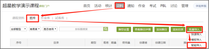 2)进入课程,找到页面上方的“资料”模块,切换到“题库”,点击“批量导入”——“智能导入”。点击“Word智能导入”,选择编辑好的文件进行导入。