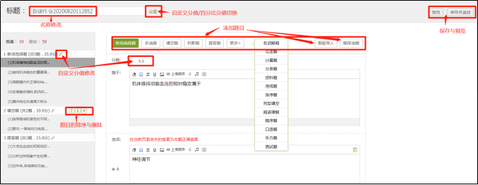 1)编辑作业的名称、分值,添加题目,修改题目等信息,修改完成后点击右上角保存。