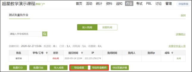 点击【导出作业附件】,即可导出学生的作业答题界面。点击【管理】——【下载中心】,即可下载学生的作业附件。