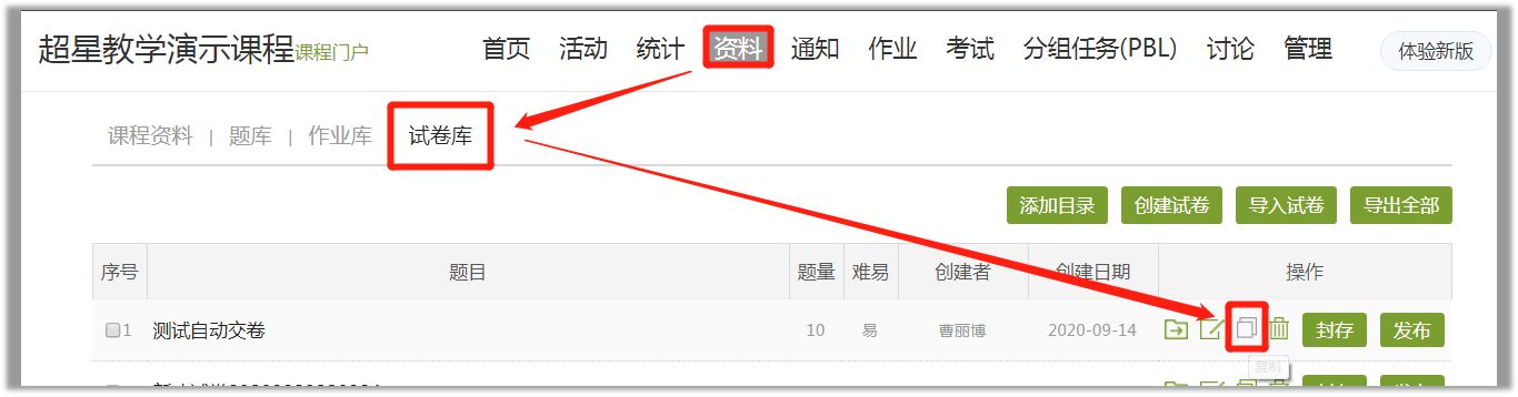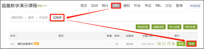 【1】点击【资料】——【试卷库】,找到对应试卷后的【发布】。