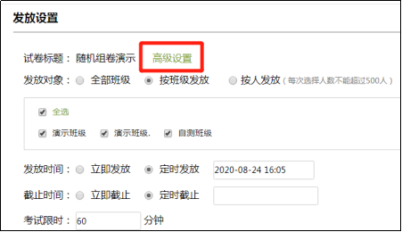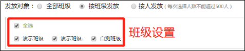 班级设置:可以选择发放的班级。每份试卷默认只能发放一次,如果班级显示灰色,则说明该试卷在这个班级已经发放过。如果需要多次发放 需要从试卷库复制一下本试卷,再发放。