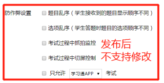只允许学习通考试:勾选之后,学生只可以使用学习通手机APP参加考试,无法用PC端参与,有效防止学生作弊。(PC端暂时无法获取学生的抓拍和切屏。)
