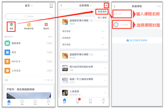 老师下载学习通之后,登录账号,在首页点击“课程”,进入课程页面。点击右上角“+”——“新建课程”,输入课程名称和封面,点击右上角“完成”,即可创建课程。