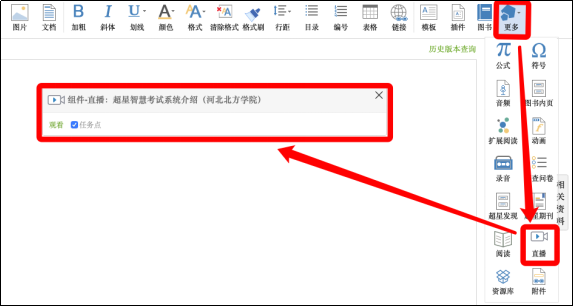 点击工具栏的“更多”——“直播”按钮,选择“创建新直播”或者“从已有直播选择”,点击确认即可。设置为任务点的直播以“直播”权重计入综合成绩。