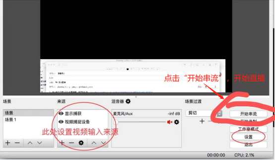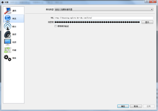 4.点击“设置”——“串流”,在URL和流密钥中将推流地址分成2段输入: