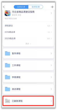 删除的课程都会在页面下方“已删除课程中”,如果想要恢复或者想彻底删除,找到对应的课程再次左滑,则出现“恢复”,或者“删除”按钮,从已删除课程中再次删除即为彻底删除,无法恢复,请谨慎操作。