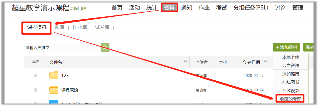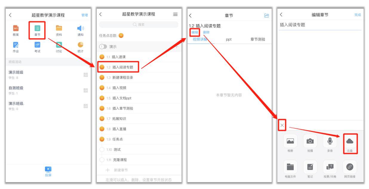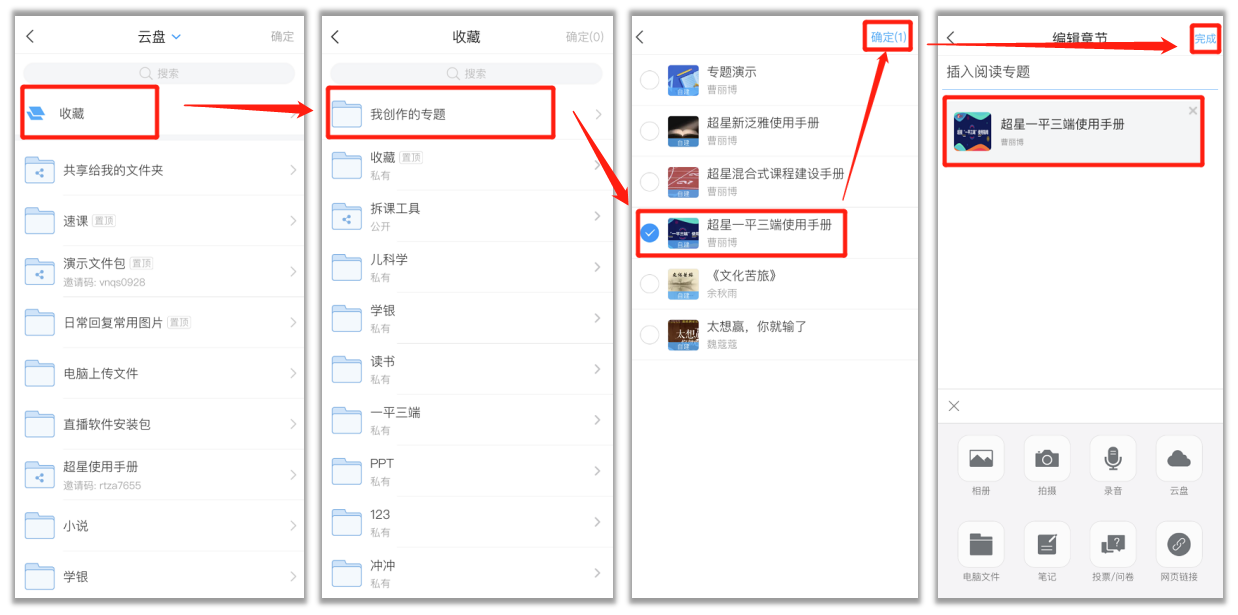 手机端:点击课程的【章节】——进入具体的章节,点击编辑,点击下方“+”,选择【云盘】——【收藏】——【我创作的专题】或者选择我收藏的其他专题,选择对应的专题,添加就可以了。