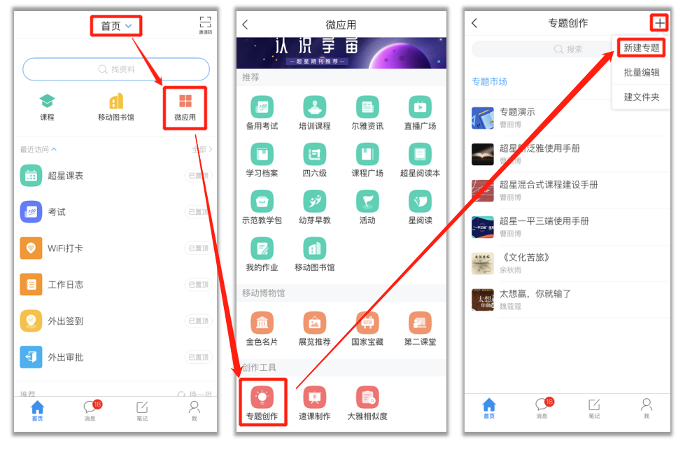 手机端: 点击【首页】——微应用——创作工具中的【专题创作】——右上角“+”,新建专题,按照步骤填写信息操作即可。