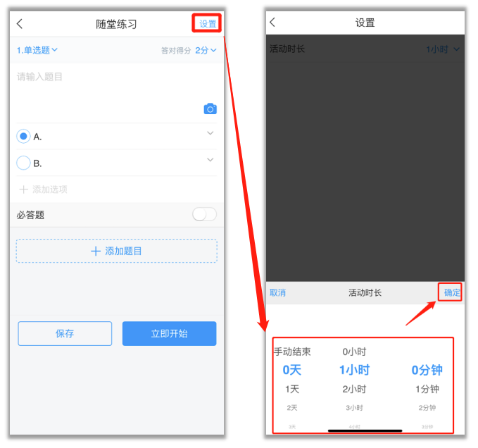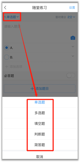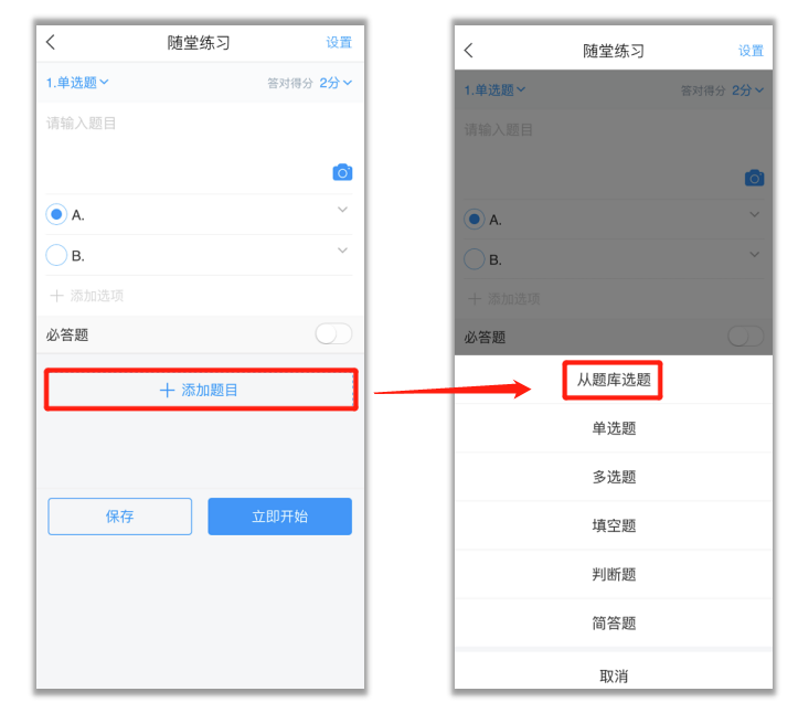 2) 点击活动中的【随堂练习】,可以直接编辑题目,点击右上角的题型,可以更换题型。也可以从题库选题,设置完成之后可以选择【立即开始】,也可以选择【保存】,在课前预设。