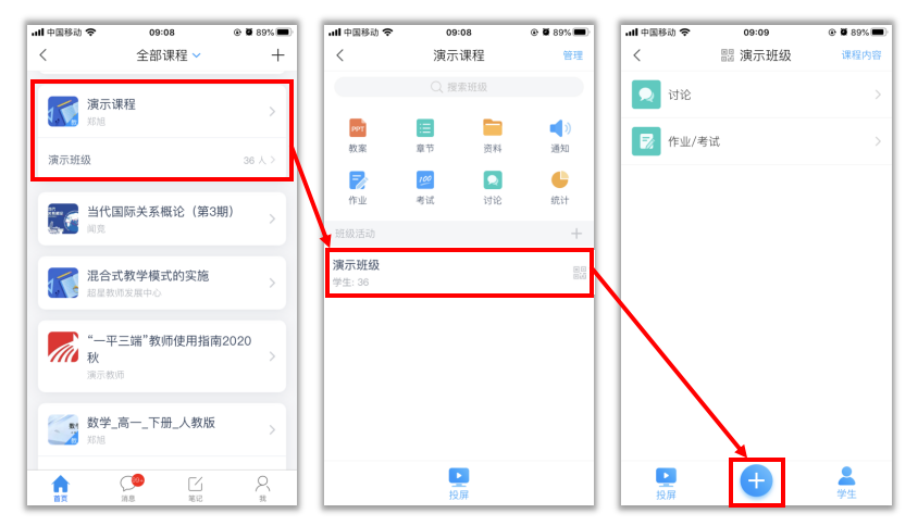 1)进入课程,点击所上班的班级,点击页面底部的“+”,进入活动发布界面。