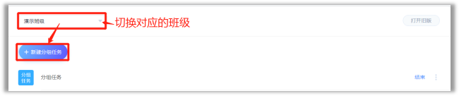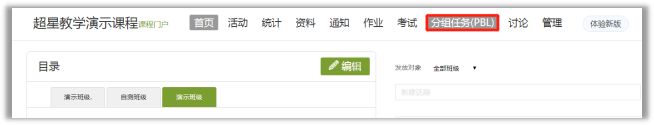 1)进入课程,点击页面上方导航栏【分组任务(PBL)】,右上角切换到对应的班级,点击【新建分组任务】。