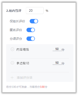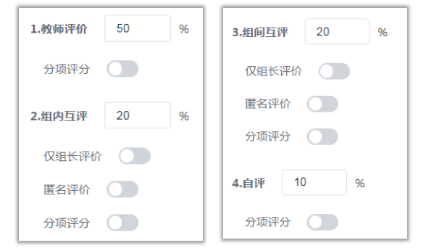 每项都可以设置分项评分,组内互评和组间互评还可以设置【仅组长评价】、【匿名评价】。