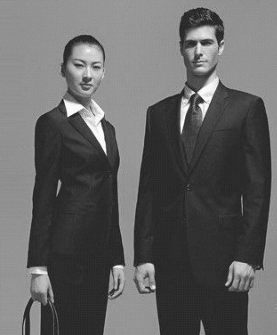 职业装即工作服装, 适合各自职业的性质、 工作环境, 实用又便于活动, 给人整齐划一, 美观整洁之感, 能振奋人心, 增强职业自豪感。 如果是旅游接待人员的工作服, 应自然得体大方; 而作为教师, 其职业服装应具有端庄、 严谨并富有亲和力的特征。