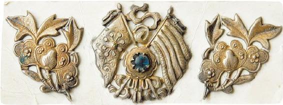 民国初年,遮眉勒子上的金属装饰件也用了民国五色旗来装扮。作者收藏