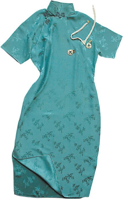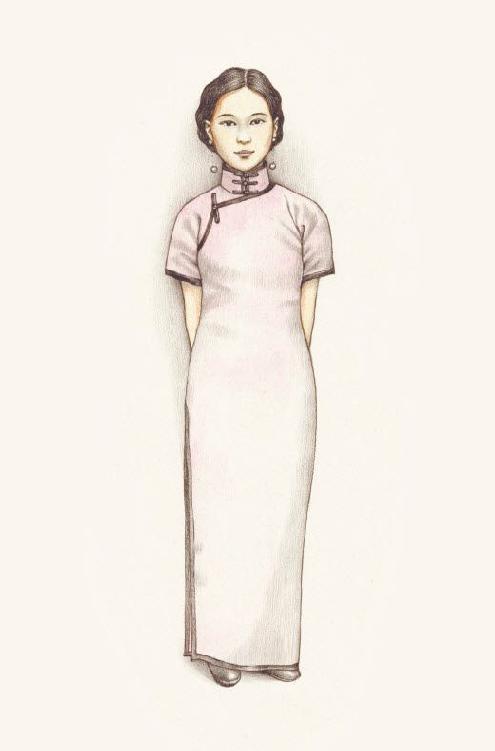 1932年后旗袍下摆开始趋长,上身逐渐合体,衣袖渐短。许觉民供