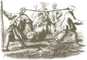 中国人的辫子总让我觉得滑稽可笑。他们的辫子可是集千种用途于一身。我见过佣人们用辫子掸家具上的灰尘,就像用鸡毛掸子一样,见过农民们用辫子抽打不肯向前走的公猪。有一次在一个叫做谢神节的月历节日里,人头攒动,我看见一个鲁莽的年轻人的辫子和两个广东市民缠在一起了!他们正开心地欣赏焰火,压根儿没有察觉。当人群散开,他们打算离开时,这个三人组合,他们对视的眼神,那情景简直太可笑了!(7)