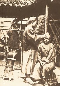 因应男性的剃顶梳辫需求,清代出现挑担走街串巷的职业理发匠。