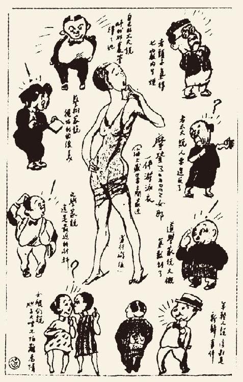 30年代初期,女子运动装多为类似今天文化衫的短袖上衣加短裤,女子泳装是连身短裙,内里加穿与之配套的短裤。1936年泳装和配套的短裤合二为一,以后还出现了泳装上衣与短裤分开的两件式。对于国人来说,眼前出现大面积女性肢体的裸露,所受到的刺激和震撼程度不亚于60年代西方的比基尼泳装带给世界的惊诧。