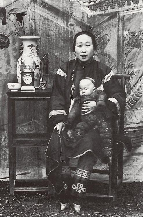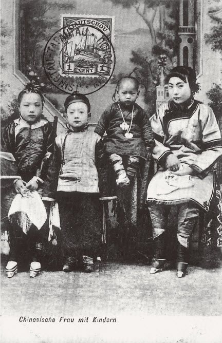 一张1909年从青岛寄往欧洲的明信片,记录了清末女子和儿童的装束。