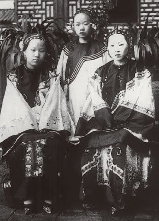 汉族女孩则大多是红袄绿裤或绿袄红裤,用带系扎腰部,扎辫,自小缠足。到清末,很多汉族少女也喜穿满族的长袍马甲,似乎与旗族少女无太大差异。