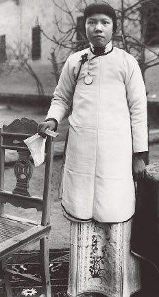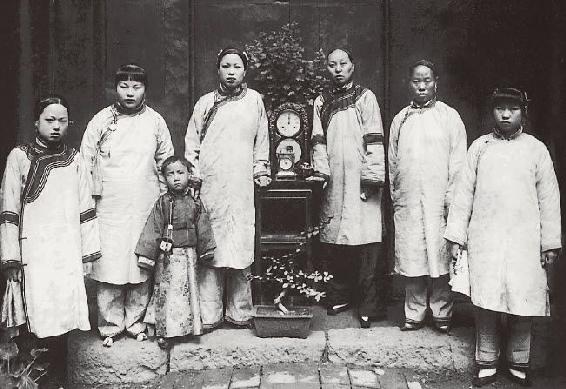 着衫裙的汉女子,其衣领趋高并挂上洋怀表,属清末时尚。