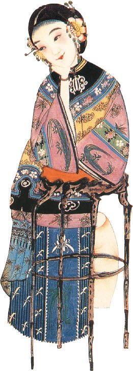 从十七世纪中叶直到十九世纪末,流行着极度宽大的衫裤,有一种四平八稳的沉着气象。领圈很低,有等于无。穿在外面的是“大袄”。在非正式的场合,宽了衣,便露出“中袄”。“中袄”里面有紧窄合身的“小袄”,上床也不脱去,多半是娇媚的桃红或水红。三件袄子之外又加着“云肩背心”,黑缎宽镶,盘着大云头。